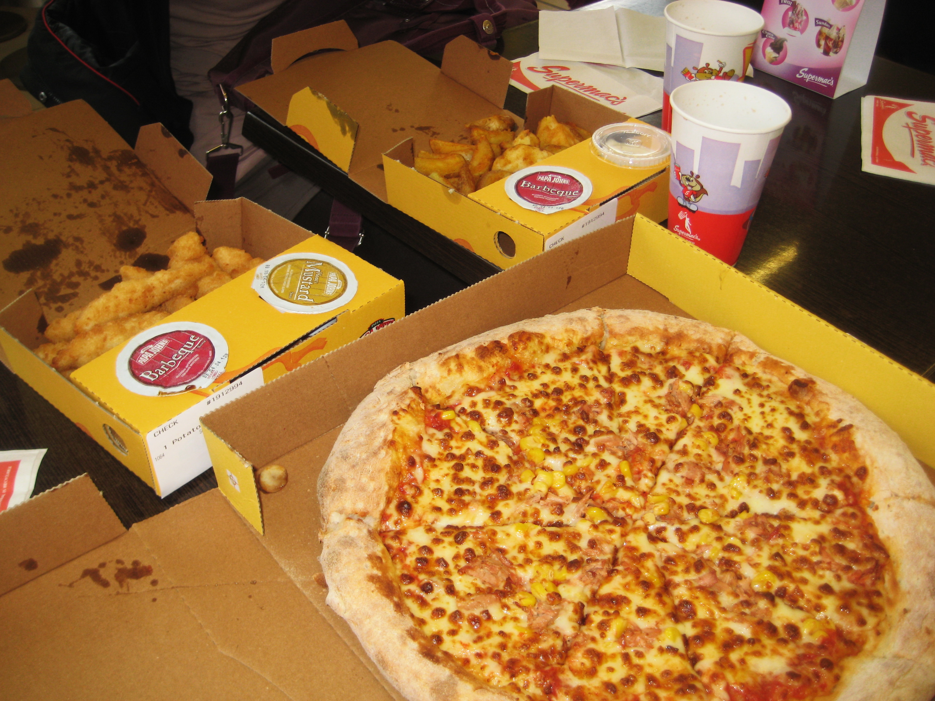 Hahaha, wenn man so will, wir waren im Restaurant – im Fastfood Restaurant. Gleich drei unterschiedliche, alle unter einem Dach, alle hinter einer Theke. Meinst du die dunklen Flecken auf der Pappschachtel?? Das ist FETT 😀