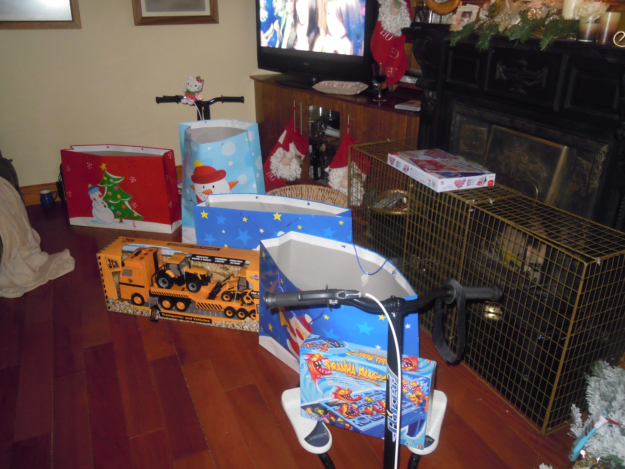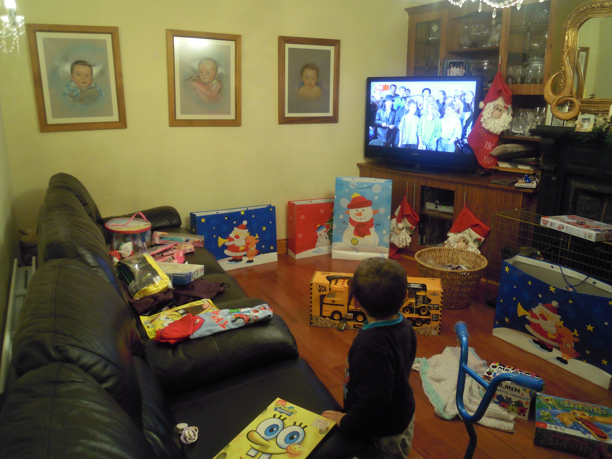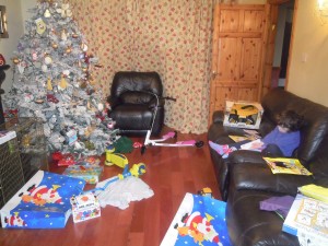 Danach ging’s ab ins Wohnzimmer (Briani war in der Zeit immer noch oben…) die andern beiden sind in der Zwischenzeit total ausgeflippt. Wenn Frauen Schuhe und Handtaschen gleichzeitig sehen – ganz neue, ganz viele, ist das Produkt daraus ausgeflippen und herum geschreien. Wenn ihr euch das vorstellt, dann wisst ihr wie es heute morgen bei den Duggan’s im Wohnzimmer ausgesehen hat. Irgendwann bin ich dann nach oben gegangen und hab mir Braini gekrallt. Und als er dann die ganzen Geschenke gesehen hat, musste er auch gar nicht mehr weinen 🙂